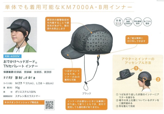 頭保護帽子 つまずきや転倒から頭をガードおしゃれ保護帽子【おでかけヘッドガード セパレート】:専用インナー TNセパレートインナー KM-4000V
