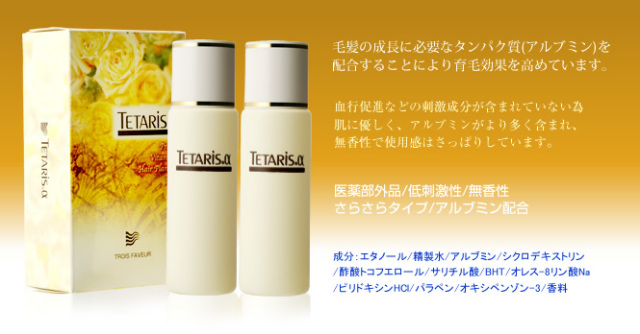 ●タイプ:低刺激性無香性さらさらタイプ(ヘアプロテインローション)●区分:日本製・医薬部外品【ご使用方法】:1回約2~3mlを目安にご使用ください。●振りかけずに、頭皮に直接容器の先をつけ、気になる部分を中心に5~6筋すり込むようにしてください。●1日2回以上必ずお使いください。テタリスαは1回使用すると15時間程度で効果がなくなります。1日2回以上使用ないと効果はありません。1回に多量に使用するより、継続する方が効果的です。●男女・年齢・症例問わずご使用いただけます。