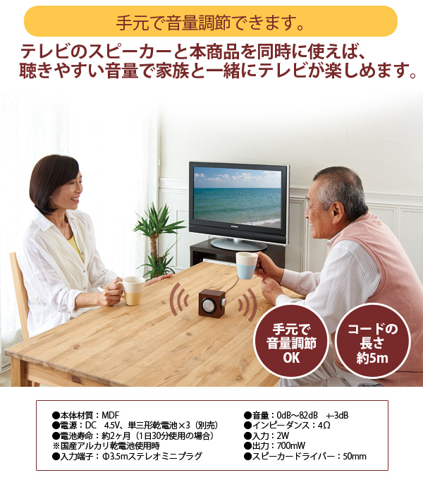 テレビの音が手元で聴こえるスピーカー。 手元で音量調節できます。コードの長さは約5m。 聴きやすい音量で家族と一緒にテレビが楽しめます。